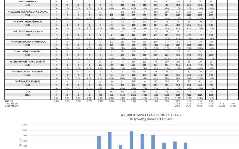 In election news the local Whaingaroa Ward is currently running 4th in the Waikato District voters return race at 15.5%. We had been running third behind the Waerenga Whitikahu Ward(currently 16.2) and the posh people from Tamahere on 16.6% but the latest stats show that Huntly has popped into third place at 15.6% Given our community’s reputation for doing things at the last minute we’re expecting a boost close to the final voting day on 11th October to get us back into the top two where we’ve been for the last two elections.
